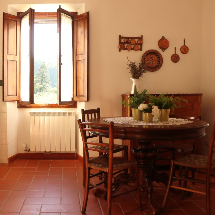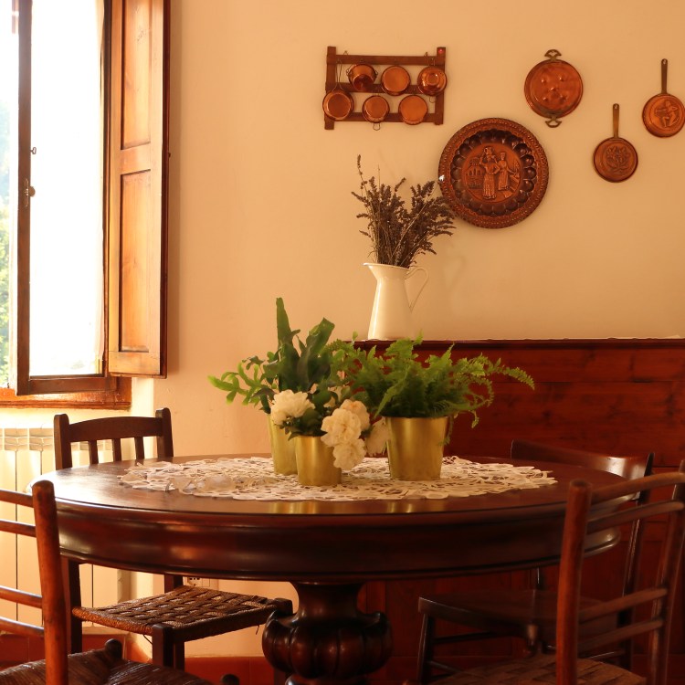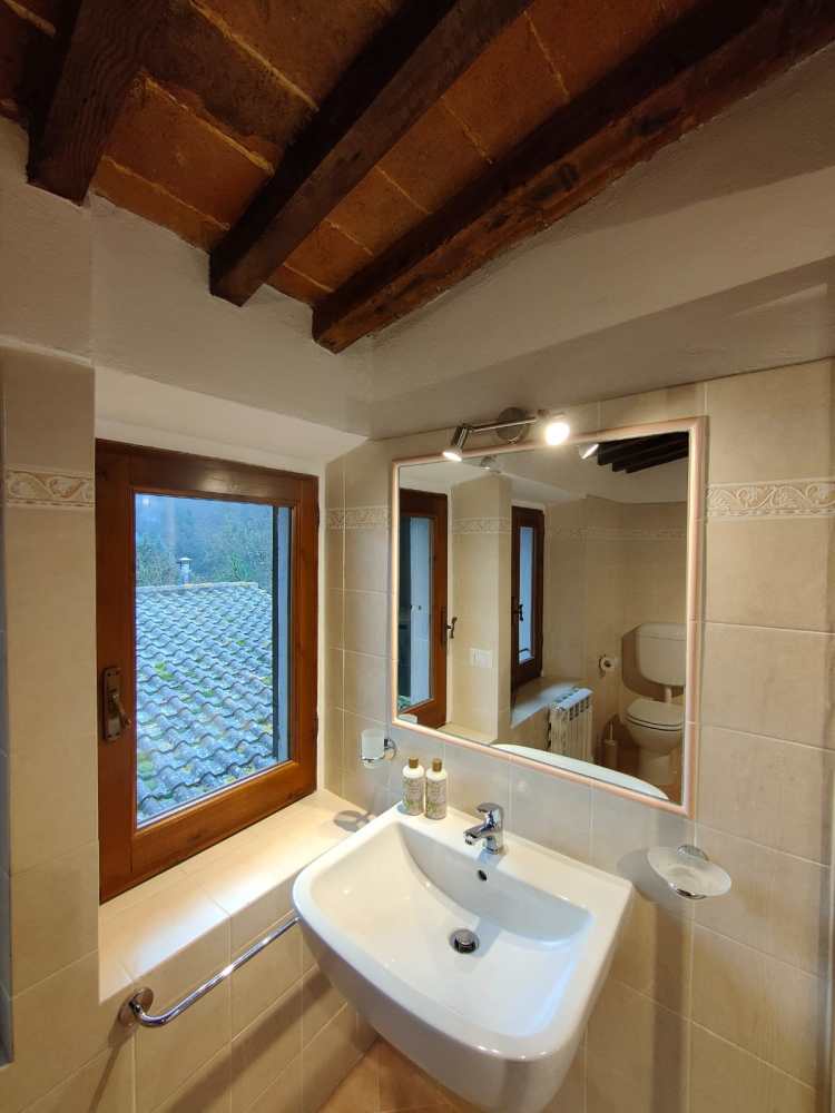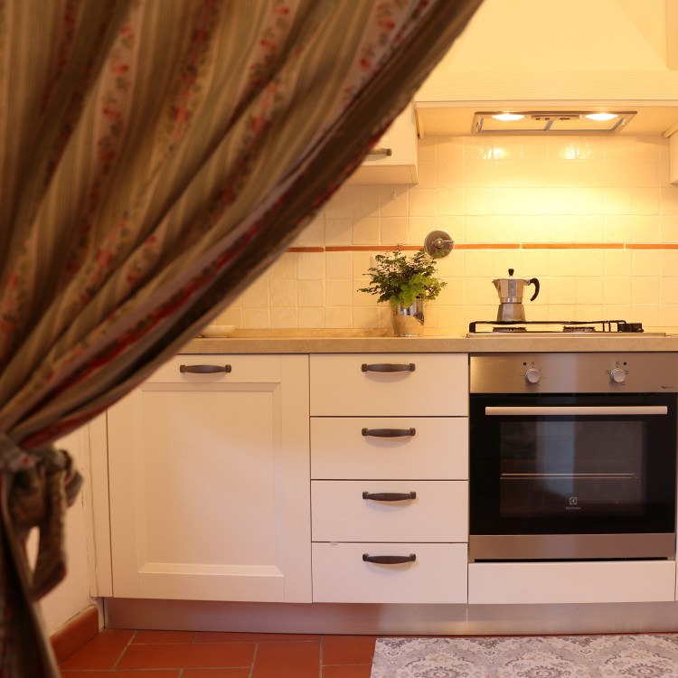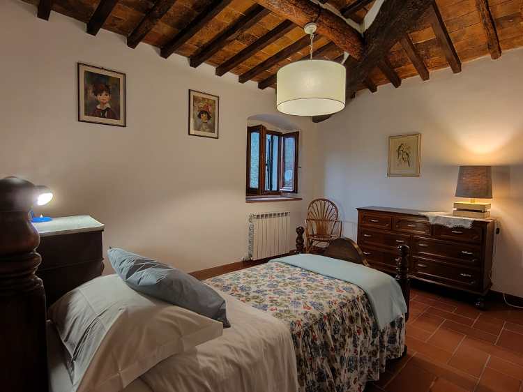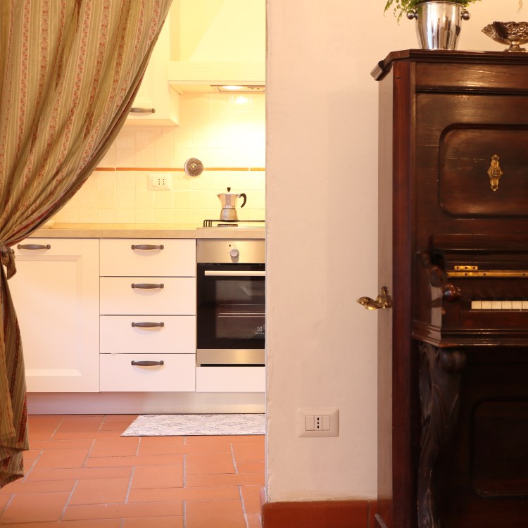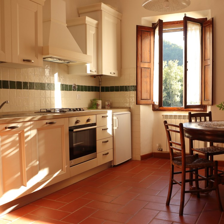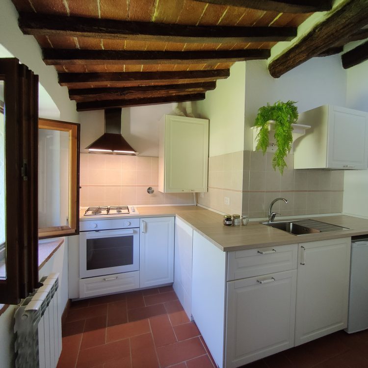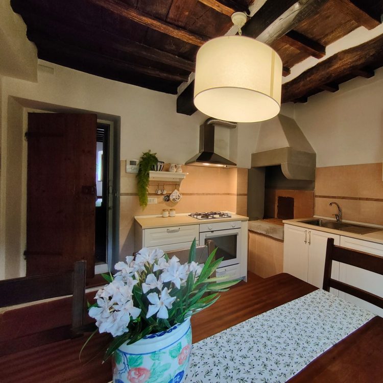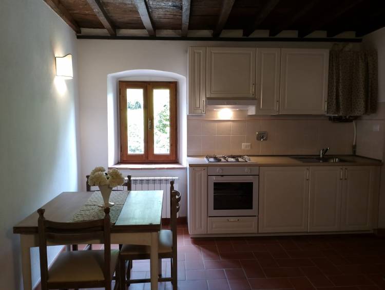 Grande cucina con sala da pranzo, salottino con due poltrone comodissime; due camere da letto, una matrimoniale con affaccio sul parco, una doppia con affaccio sul retro collina. Un bagno con box doccia.
