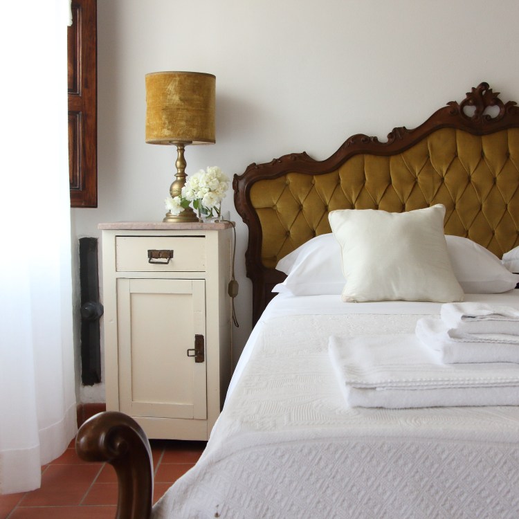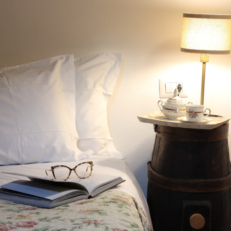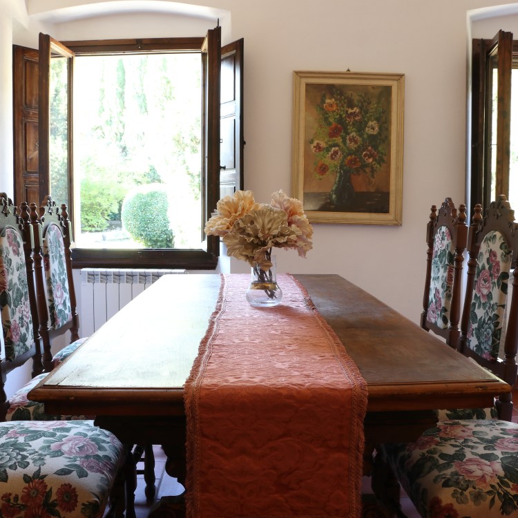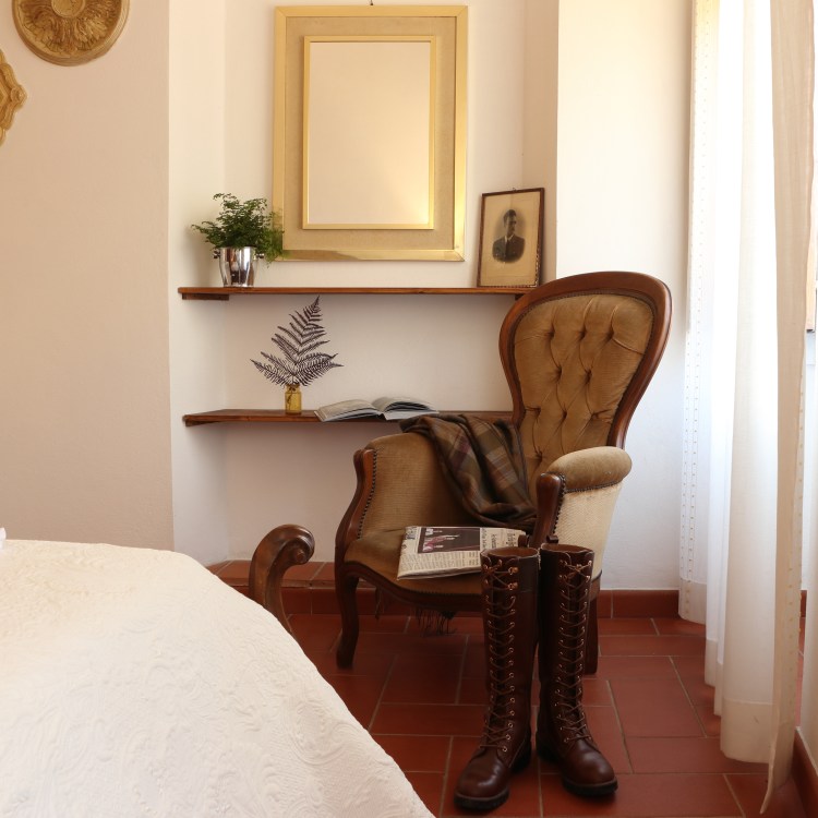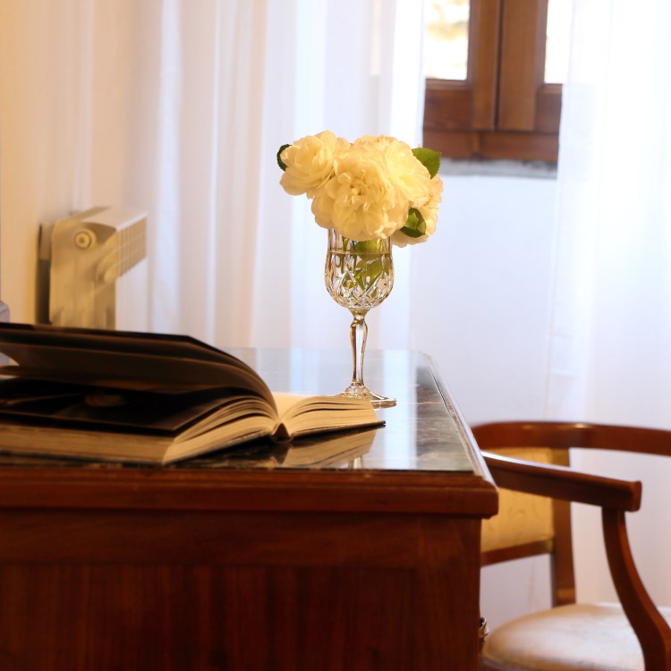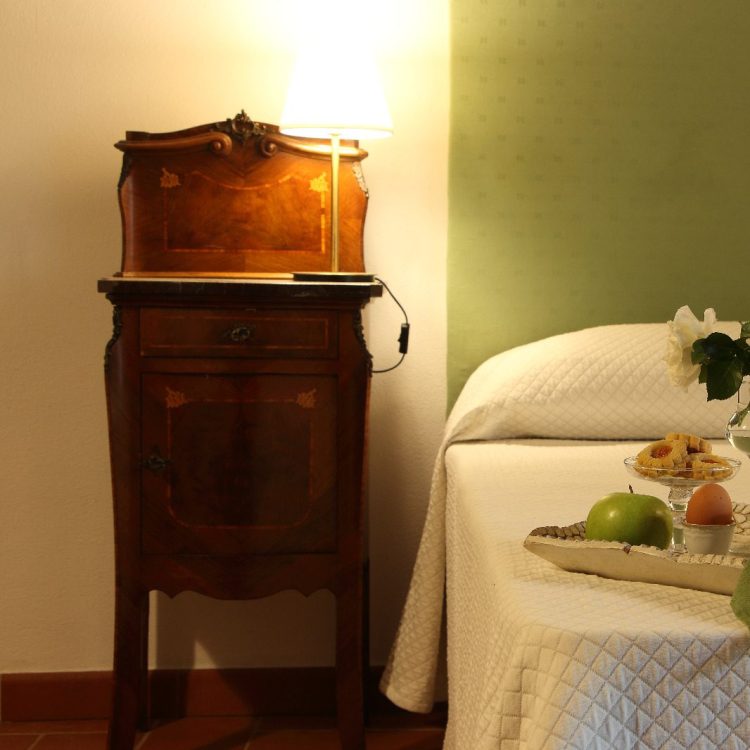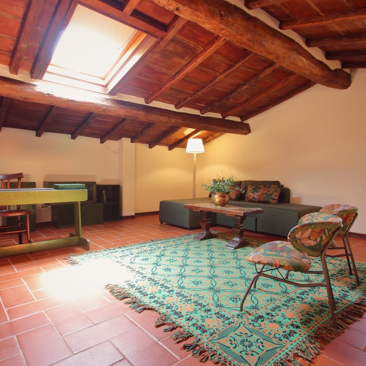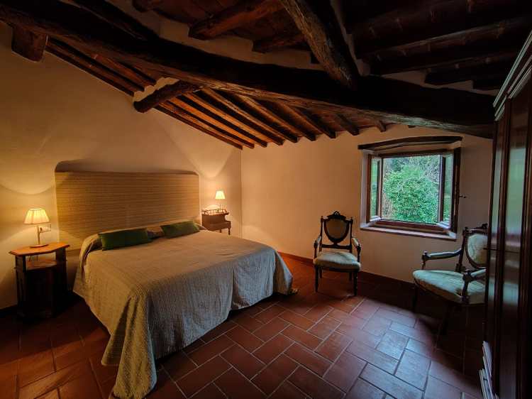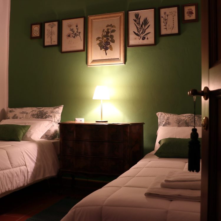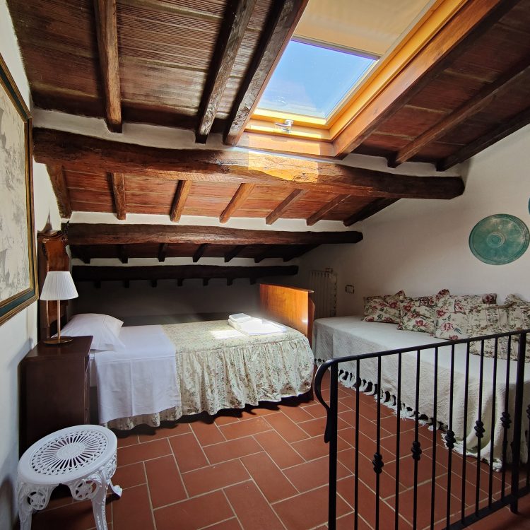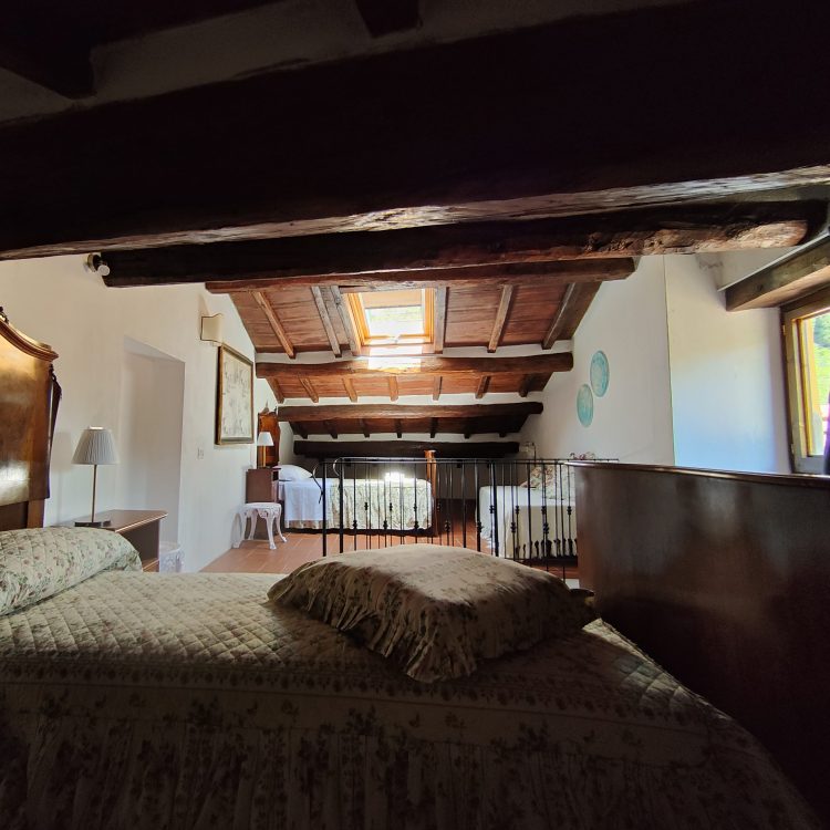 situato al primo piano dell’ala destra della villa. Grande camera matrimoniale con travi a vista, armadio d’epoca e vista sul parco. Sala da pranzo e cucinotto. Bagno con box doccia. Ospita due persone.