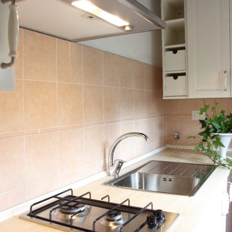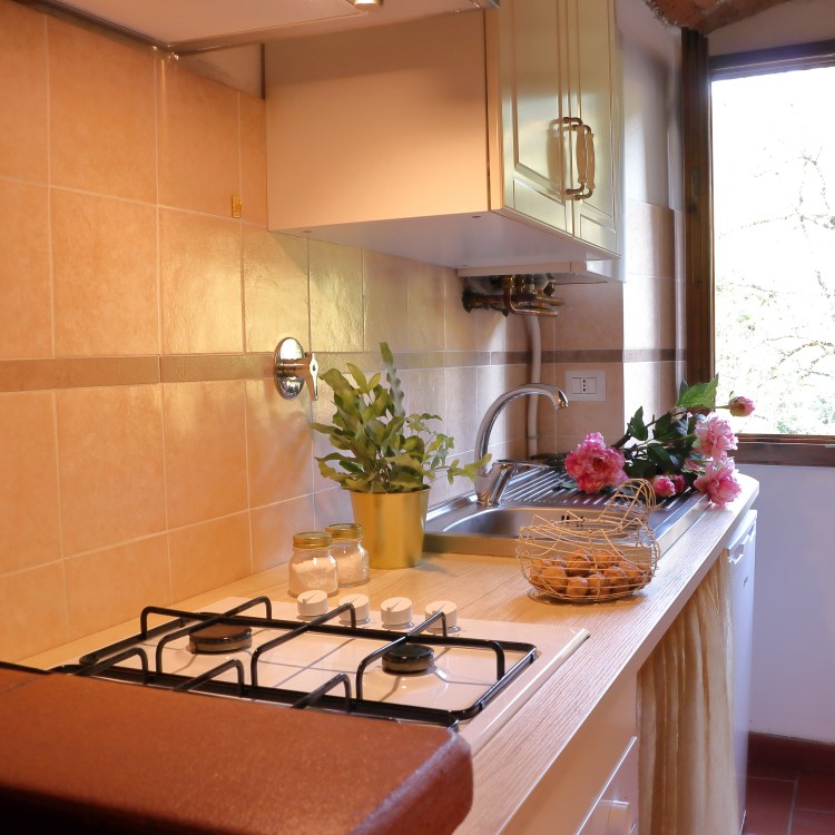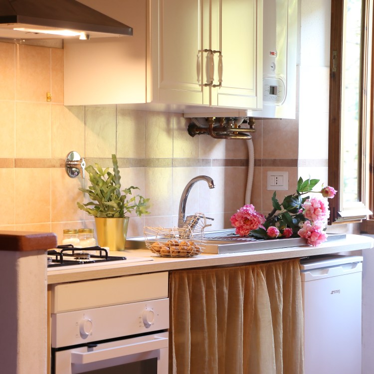 Ampia e luminosa cucina con vista sul parco con piscina, cucina attrezzata, un bagno con doccia, camera con letto matrimoniale e due lettini singoli.