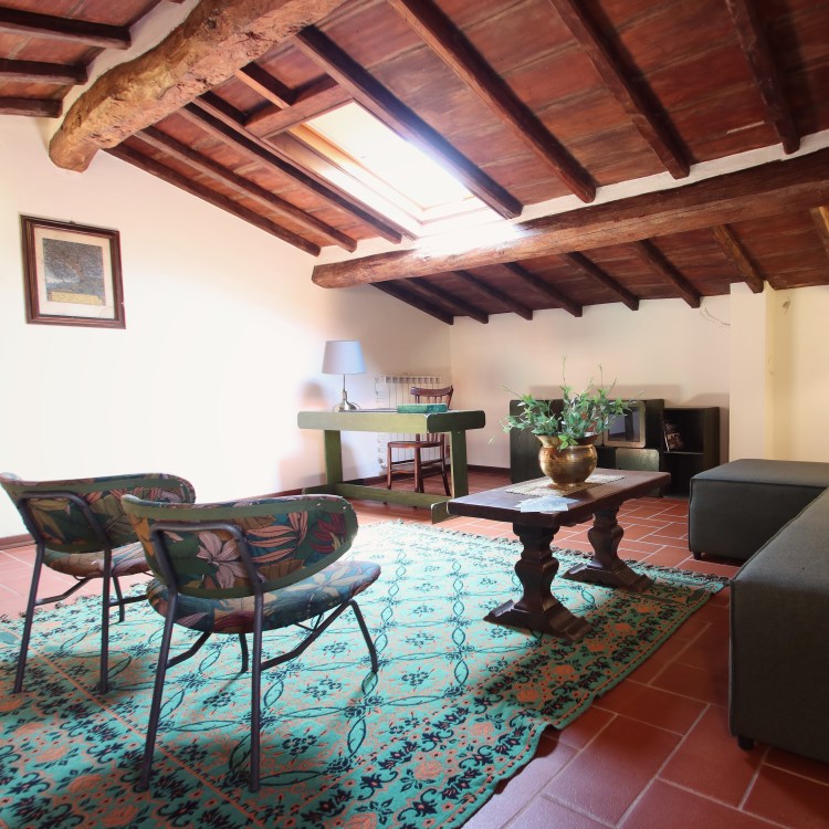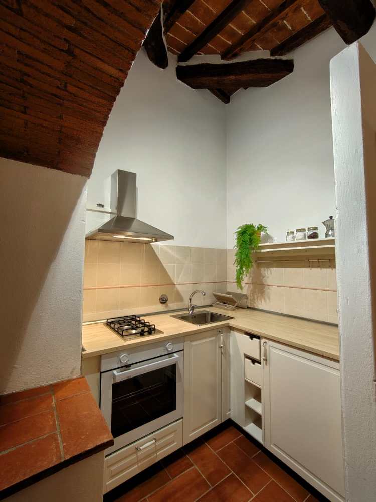 Grande cucina, due camere da letto, un bagno. Particolarissimo salotto in mansarda.